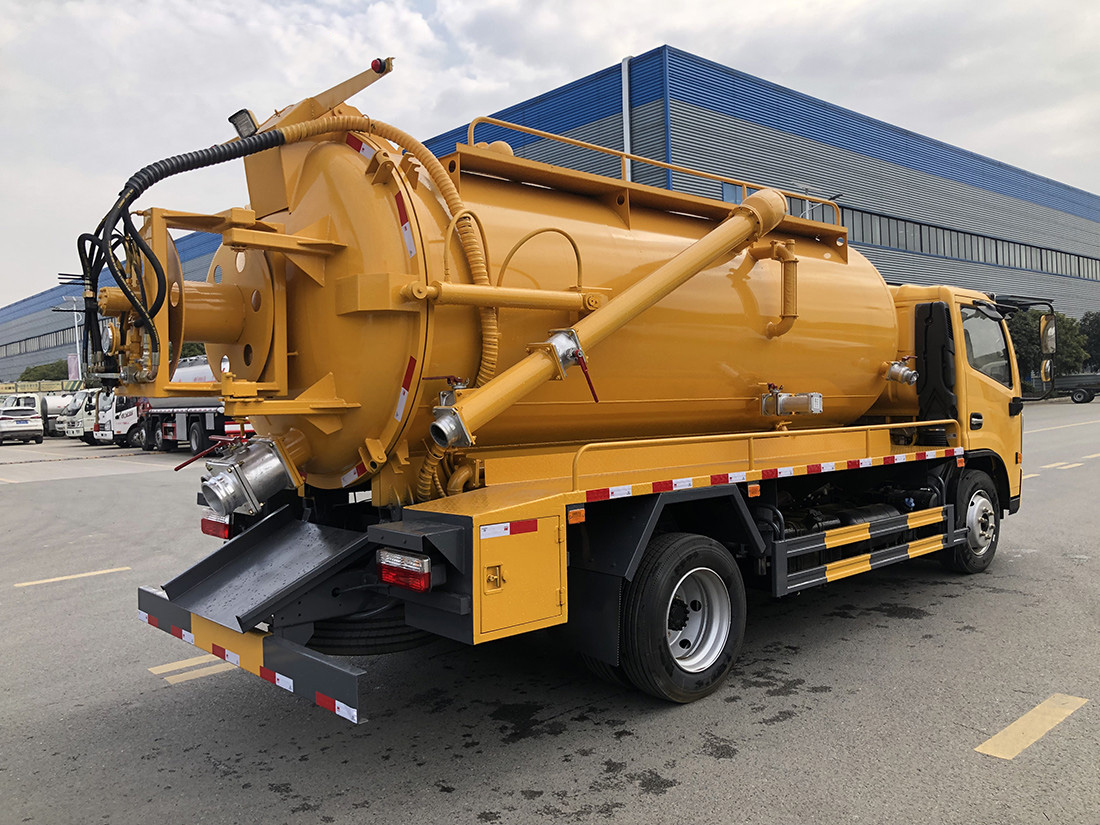 吸污部分:7方污罐,罐体6mmQ235优质碳钢,配淄博SK-12水循环泵,8米吸污管一根,进气管加不锈钢过滤网,真空防溢阀,后盖卡扣锁紧,视污量管,后尾部加装1个力拓牌100mm的球阀吸污口150mm排污口,100mm口径侧抽,罐体带举升功能,后门带液压开启。